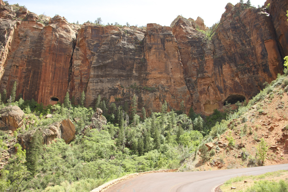 UT 9 ascends the face of the mountain and then then enters a tunnel nearly a mile long. The holes in the cliff are for ventilation and removal of tunneling spoil during the construction process. The highway is inside the cliff.