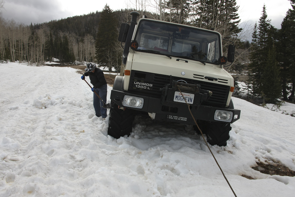 After perhaps 40 miles of dirt road, we passed beyond the nearly 10,000 foot Navajo Peak. The road was on the north side of the ridge, and therefore was shaded from the action of the sun resulting in substantial snow banks. We attempted to navigate through the shallow part of the drifts, but the lip of the roadway collapsed due to the wet soil. We slipped sideways and we headed no way but down. So, we hooked up the winch and prepared for an extraction. We were the first vehicles through this area, so we had to bust through many snow banks to get this far. Plus, our map showed that we were just a few kilometers from the main road, so the urge to continue on was strong. It was late in the day, getting cold and a 40 mile back-track would have been no fun. So, we pressed on.