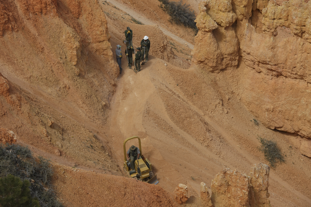 It is reassuring to know that all road crews are the same. Once there is a machine at work, all other workers will stand and watch. Here the crew watch the mini-dozer push dirt around.