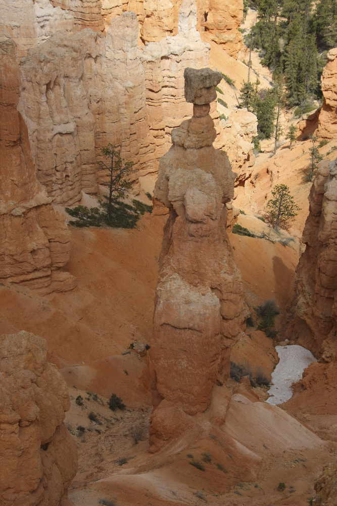 There was still snow in the deep gullies of the canyon. These hoodoo structures occur when there is harder cap rock overlying softer strata.