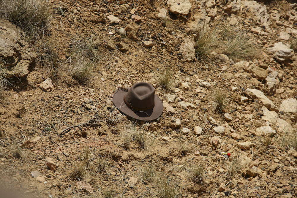 My expensive Akubra hat sitting in a canyon 50 feet below my position and totally beyond recovery. The wind took it before I could react. R.I.P. It was a good hat, now it is just "tourist trash".