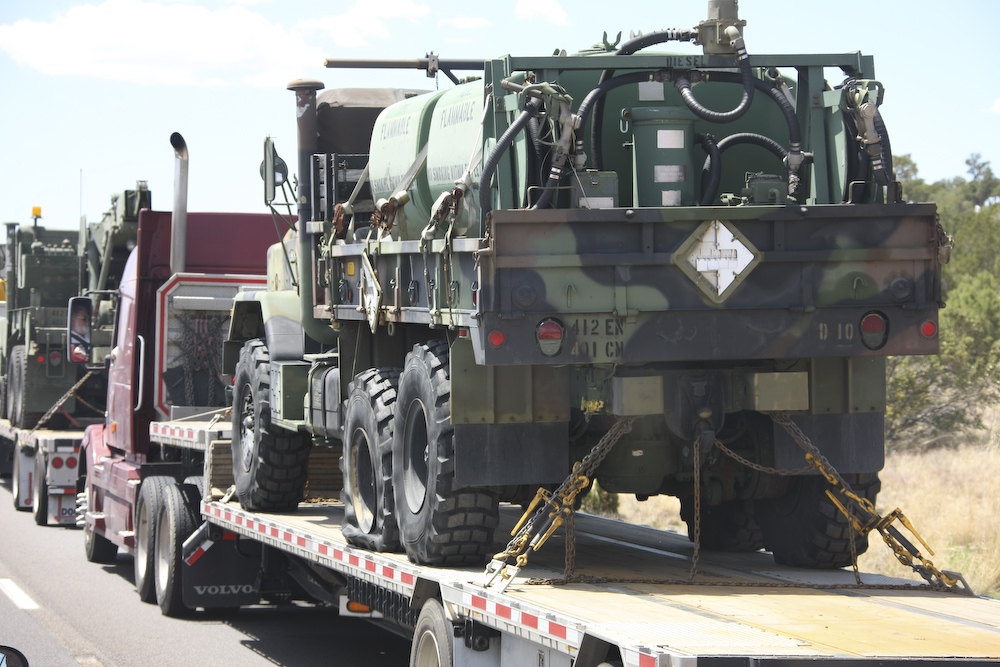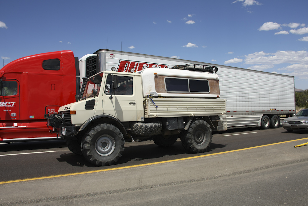 All traffic was stopped. The mog looks pretty small compared to a full 18 wheeler. We took the traffic stoppage for about 45 minutes, then we bailed and crossed the median and went back to Seligman and took old Route 66 to Kingman where we stopped for fuel and lunch. Then, we headed to Needles where it was 122 degrees when we passed the inspection station. The A/C in the truck was barely able to keep up and we burned through 8 liters of water and several Gatoraides before we got to Barstow for the night.