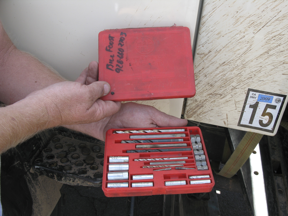 As I had all my stuff spread out in the parking lot, several folks came by offering assistance. This one fellow, Bill Foust, went back to his house to lend me, a total stranger, a set of professional screw extractors. An extremely nice gesture. After I saw the welds on the spare tire mount, we decided to abort any attempted parking lot fix.