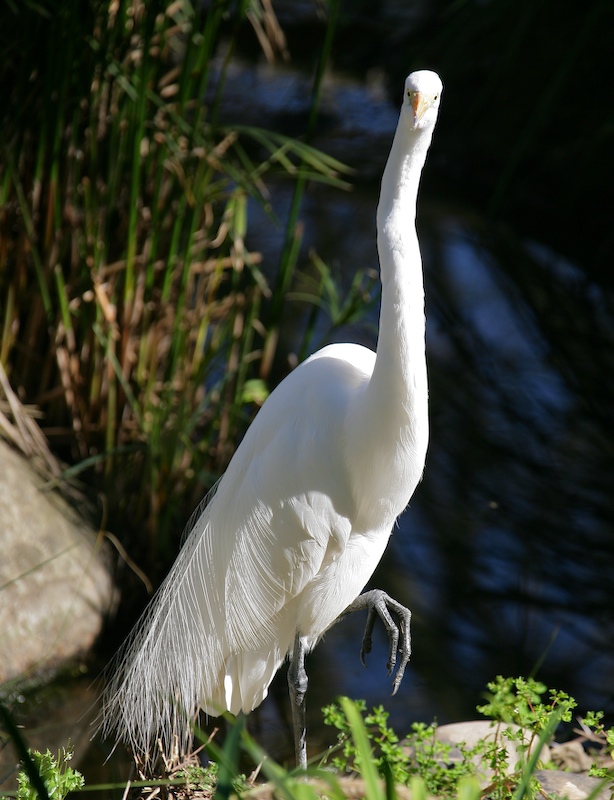 This bird is brilliant white which looks pretty interesting against a dark blue pond.