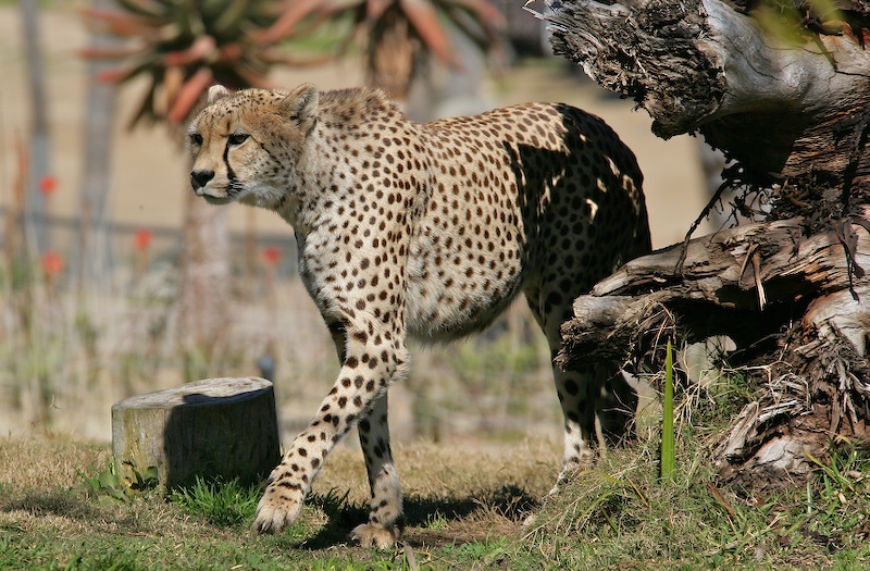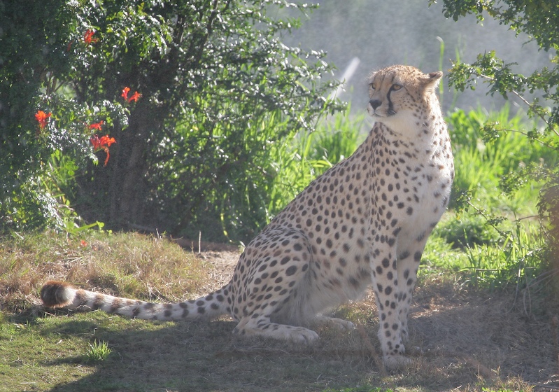 We decided to take the tram ride around the perimeter of the large enclosure. After boarding the tram, the sprinklers came on and doused the cheetahs. Since it was hot, they did not mind the mist. In the shot above, the mist can be seen obscuring the cheetah.
