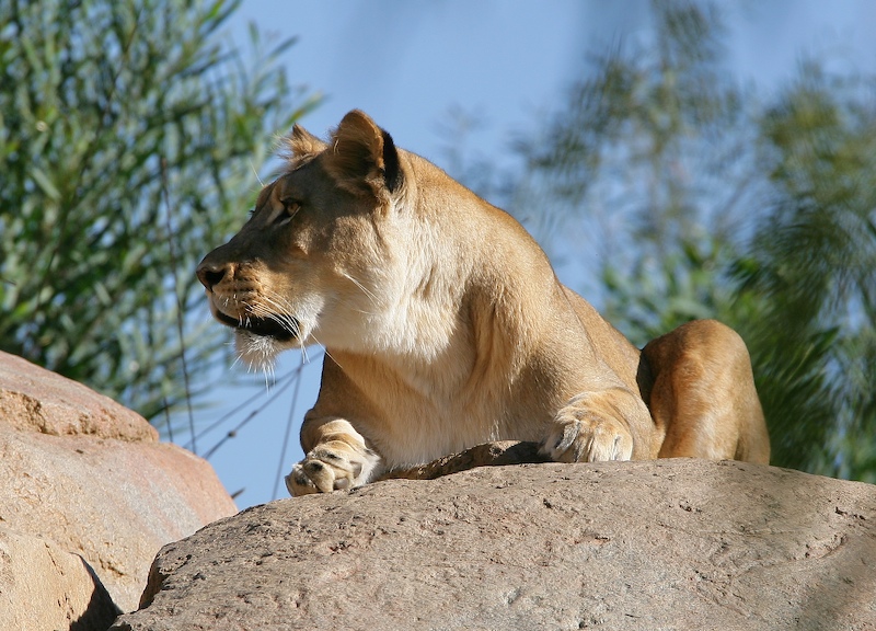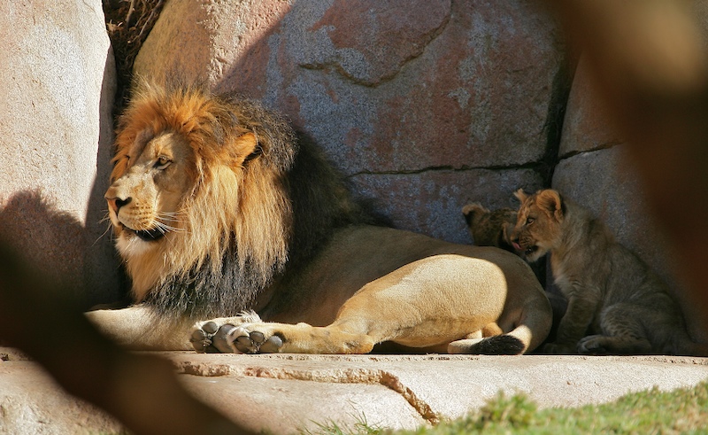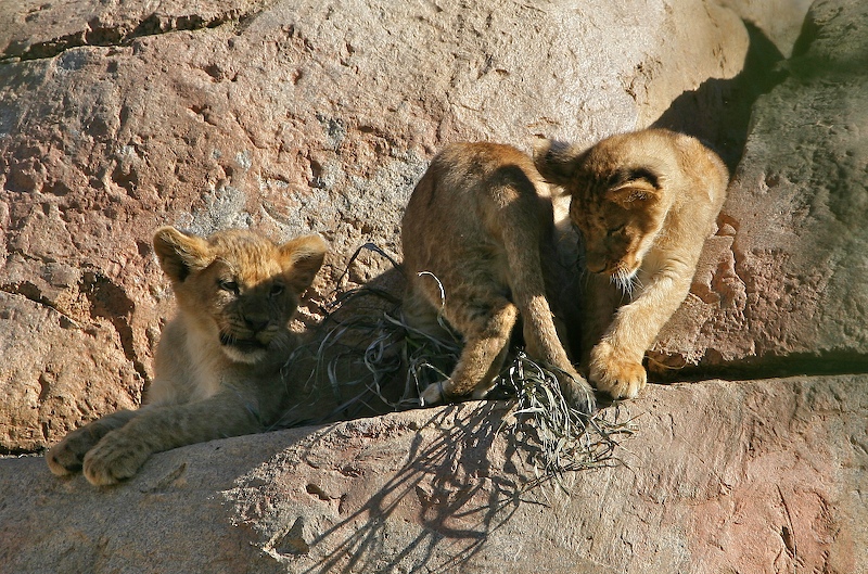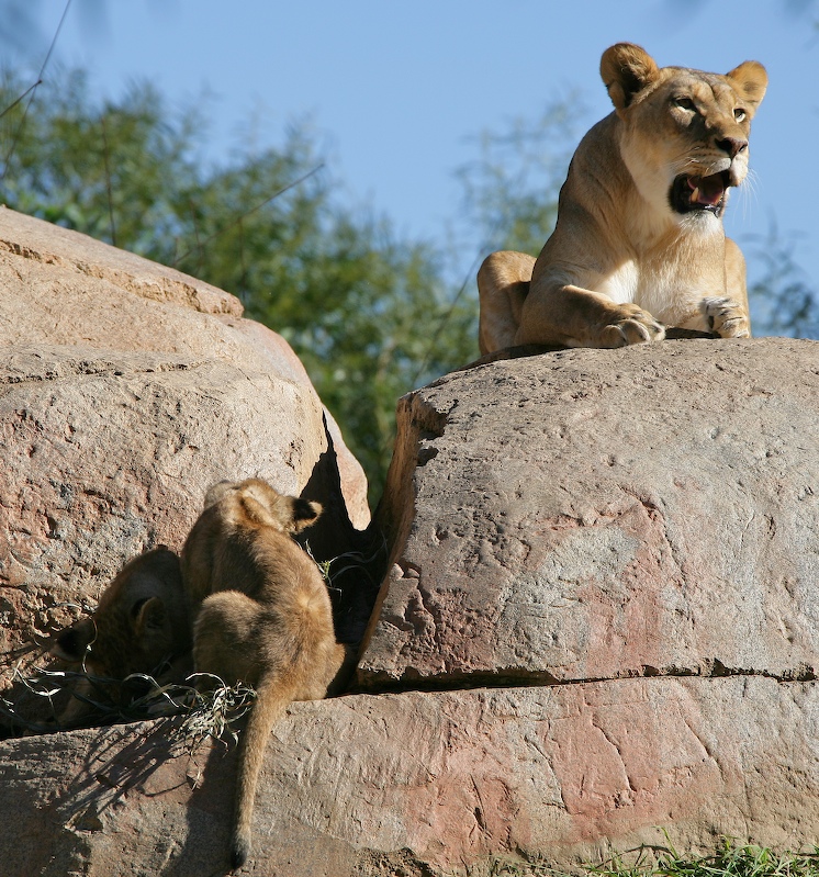 The Park has a big pride of lions; one male, 2 females and a set of new cubs only 13 weeks old. Here, Leo baby sits several of the cubs.