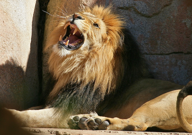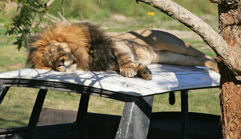 Leo had his fill of being bitten by the cubs, so he retired to the peace and comfort of the roof of a Land Rover that was placed in his enclosure. He was high enough that the cubs could not get to him.