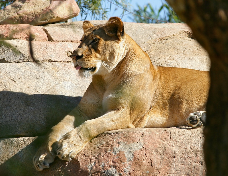 Life is good as a lioness at the Park. Note the tongue sticking out.