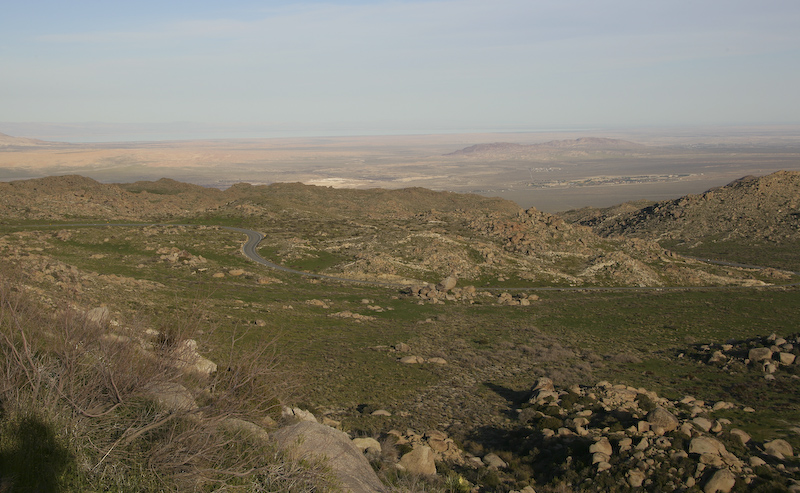 At the start of the Montezuma Grade, I stopped to admire the view. In the distance is the Salton Sea. The Ram's Hill development is visible at the right center of the photo. Note how green the landscape is as a result of the recent rains.
