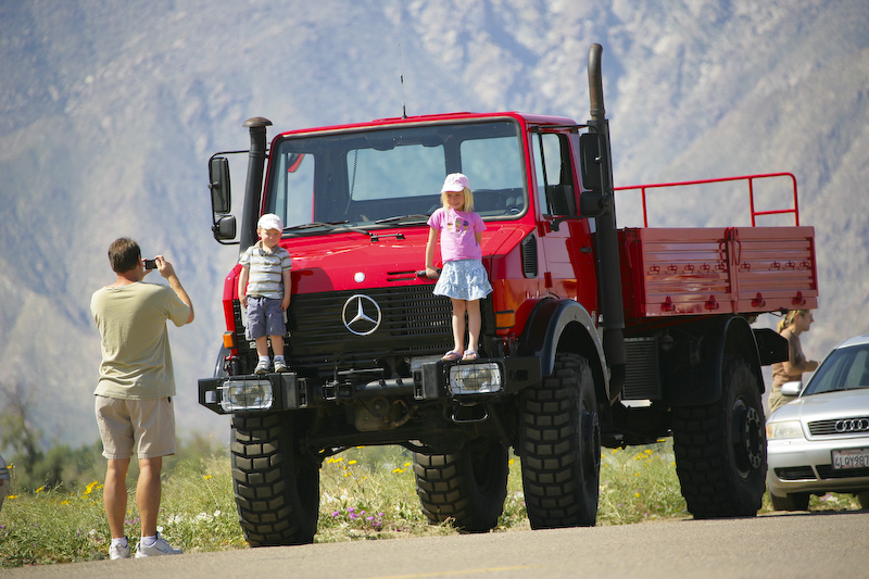 Richard's Unimog 2450L serves as an ad-hoc photo studio for Darren's children.