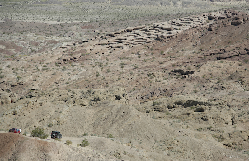 These two vehicles are scoping out the drop-off. Note the wind caves on the far ridge.