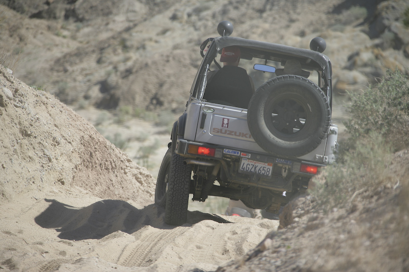 Kai led over the drop-off with Wally following. Kai's Ural is just visible underneath the Samurai.