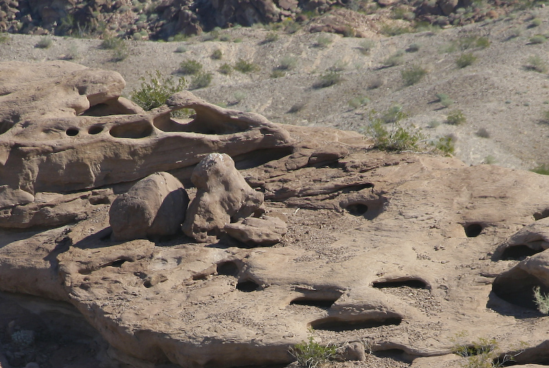 The wind blows sand that erodes interesting shapes into the sandstone. Note the see-through cave to the left of center.