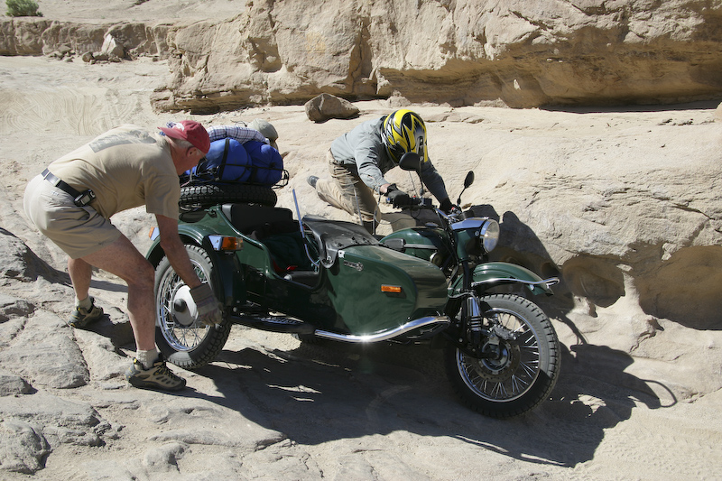 Kai got the Ural hung up on the exhaust pipe. Here Mark and Wally assist.