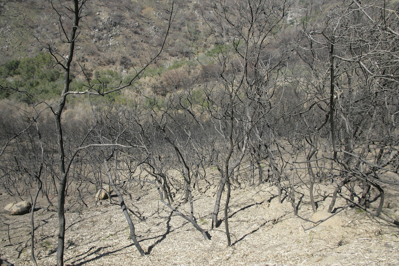 We decided to take a new route back to San Diego and went via Black Canyon which is a steep, narrow mountain road. Along the way, we came into the area that was burned by the last set of wild fires. As can be seen above, the fire totally cleaned house in some areas of the mountain while leaving other areas intact. Note that only the trees in the actual river bottom survived; everything else burned.