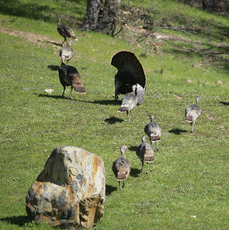 Near the exit to the hard-core portion of Black Canyon, we came across this flock of wild turkeys. There appear to be 2 males and 7 hens in this group. Here, one of the males spreads his tail feathers to give the hens something to follow.