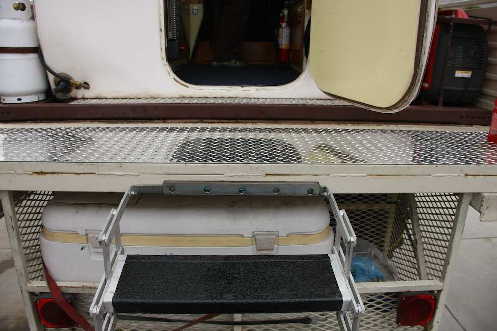 The tailgate of the mog was uneven and hard to walk on, so we added some aluminum diamond plate. We also added Hurculiner polyurethane anti-skid coating to our stairs. The stairs came with an anti-skid tape, but it did not work that well. Last year in Yellowstone, I slipped down the stairs when they were wet. So, given that we were going to places where it rains, action was required.