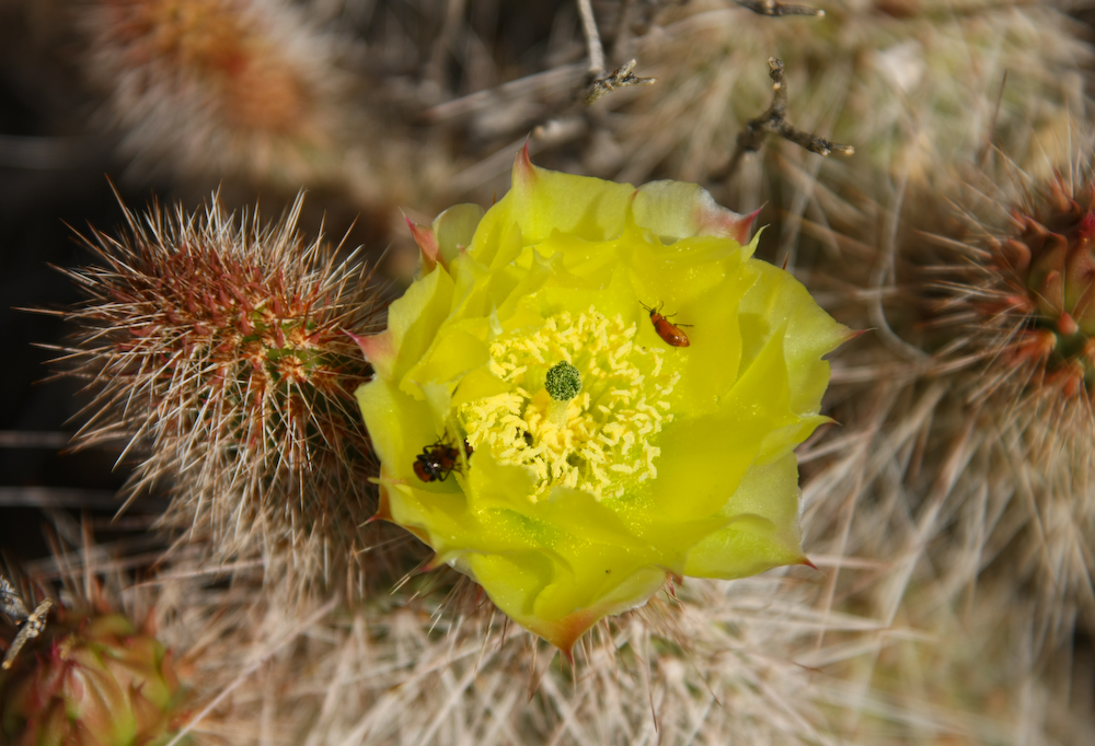 Some of the cactus were in bloom. Above, you can see the insects working hard. From the Clark Mountain area, we headed northeast back to I-15 and then to Las Vegas.