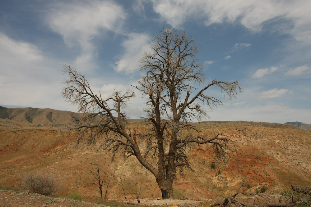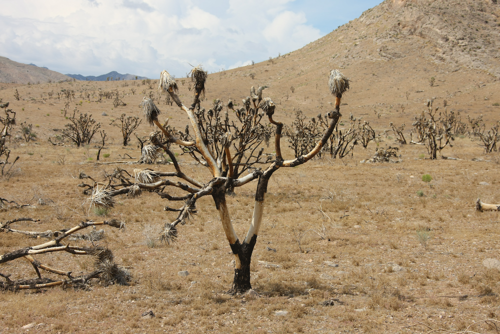We had a nice, uneventful night and next morning we broke camp and continued on toward St. George, UT. Our path took us deeper through the burned area. Above, a lone tree remains.