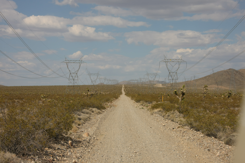 From San Diego, we headed north along I-15 to the Mojave Desert near the California-Nevada state line. From there, we headed north until we hit the power line road and then turned east. Above, the power lines can be seen heading toward the east. We followed the lines for several miles, then headed south into the Clark Mountains to find a camp site.