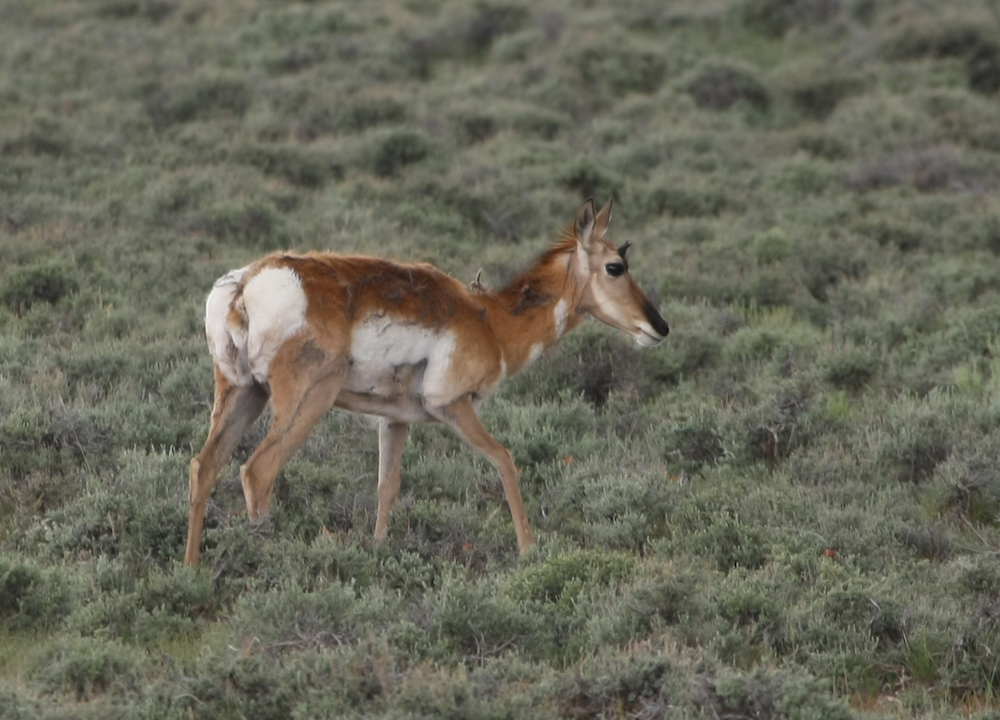 Next to the road, I spotted this young antelope. The odd patterns in the fur are due to winter coat being shed. This looks like a youngster.
