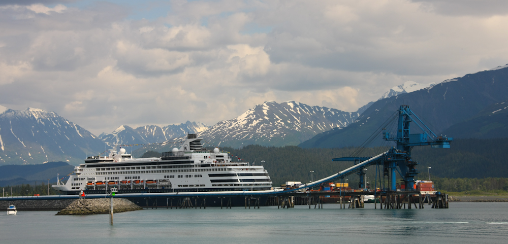 Seward is a working city and has the ability to load ships with coal with the conveyer belt machine. Seward is also a port of call for some of the cruise ships that travel the Alaskan waters. One was in port when we arrived.