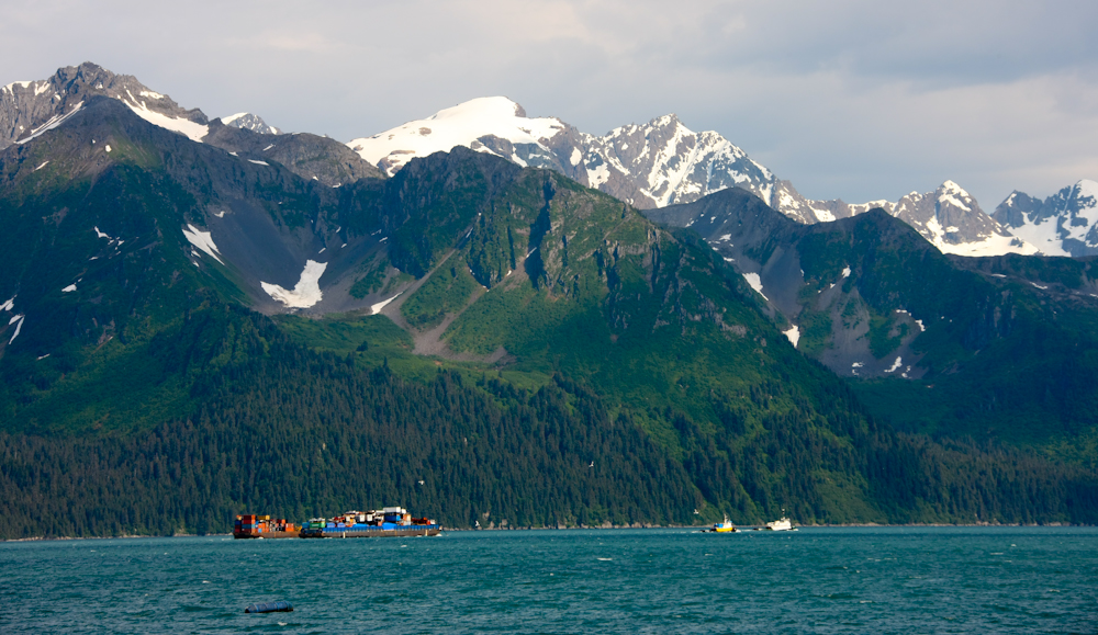 The port of Seward has a terminal for the Alaska Railroad and they carry plenty of cargo. Above, two cargo barges are towed by tugs toward the Gulf of Alaska.