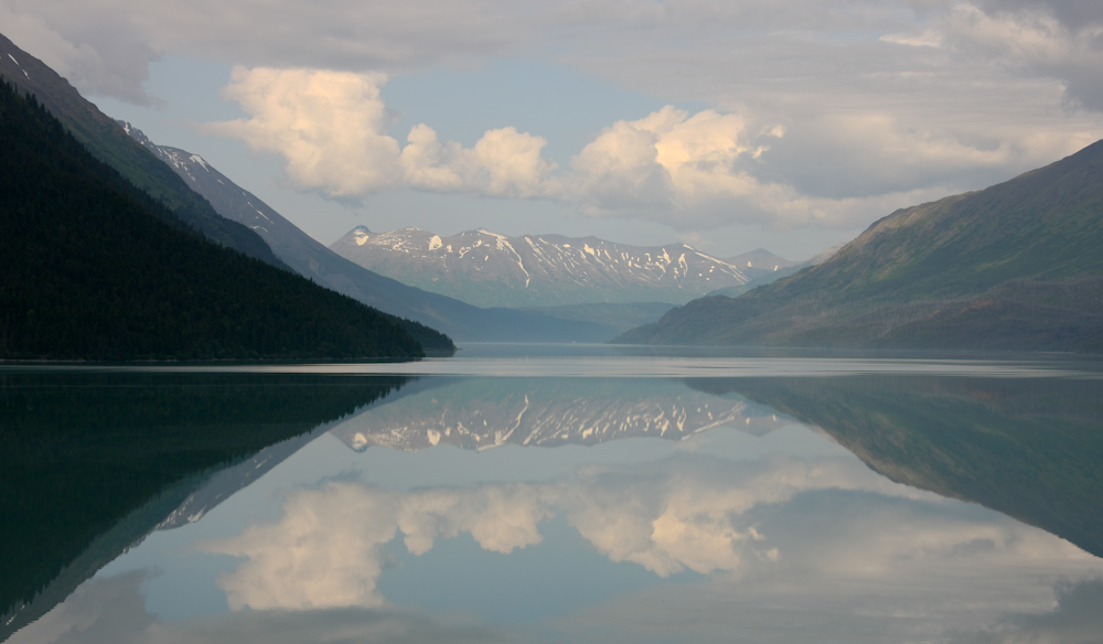 Next morning, we headed north over Moose Pass and got a nice view of reflections in Kenai Lake in the morning light.