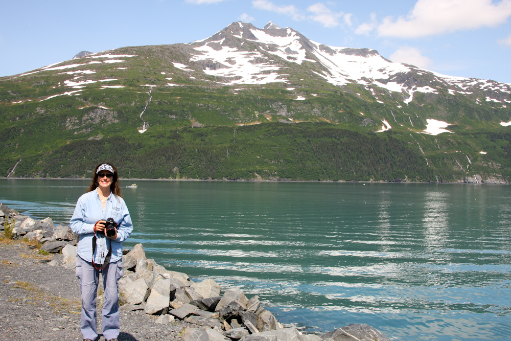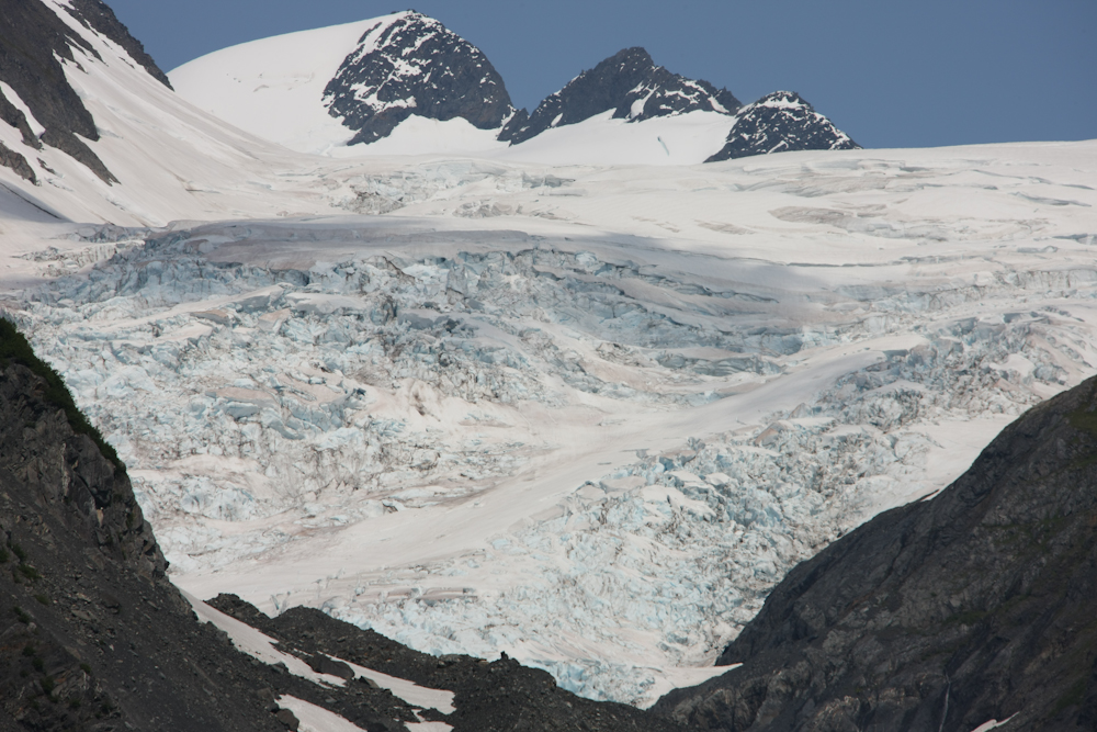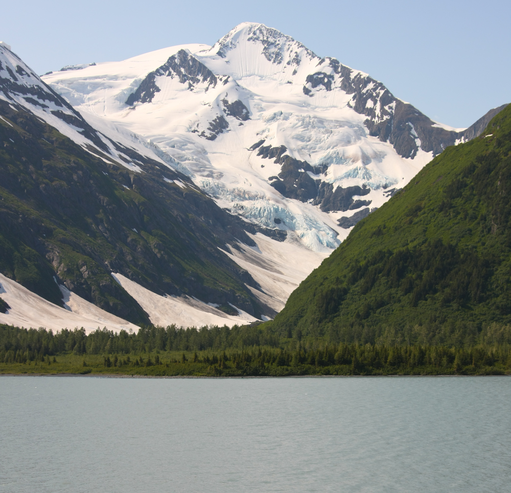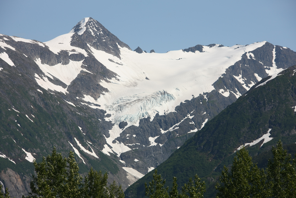 The road to Whittier goes past Portage Glacier, and many others. Note the light blue color of the water due to the rock flour from the glacial runoff.