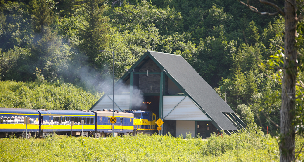 Whittier is on the other side of a large ridge and the only way to get there is through the 2.5 mile shared-use tunnel. Railroad tracks run through the center of the roadway. The train went first, then oncoming, then we went south. The wait was about 45 minutes.