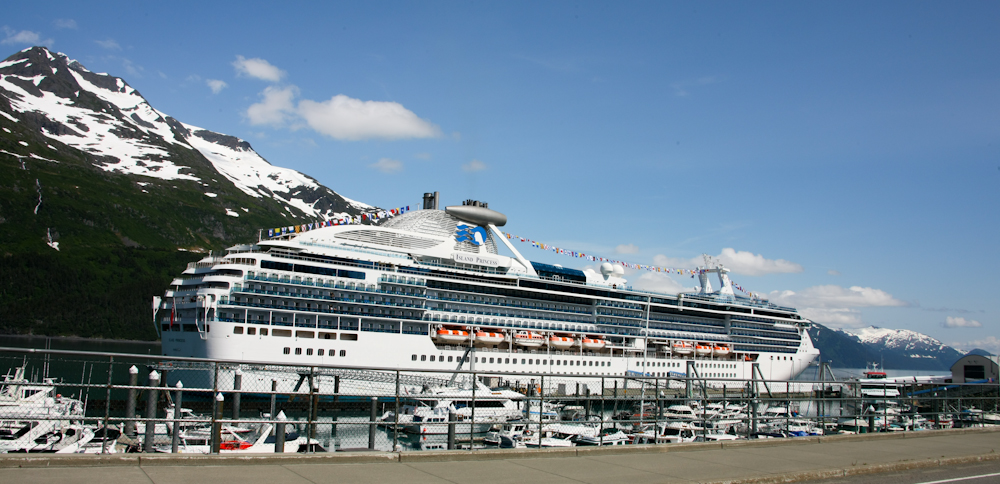 The small boat harbor at Whittier. The Island Princess is visible in the distance.