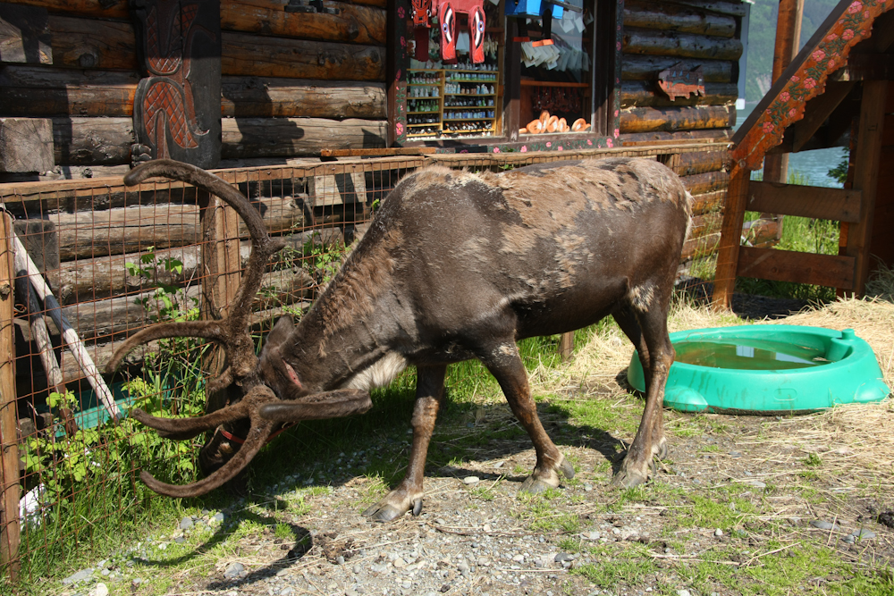 One of the tourist shops had a reindeer in a cage. He totally ignored us and was completely focused on eating the weeds.