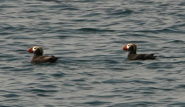 Nearby we spotted these puffins. The colors of their beaks are muted in the haze. Sadly, they never got that close to the boat.