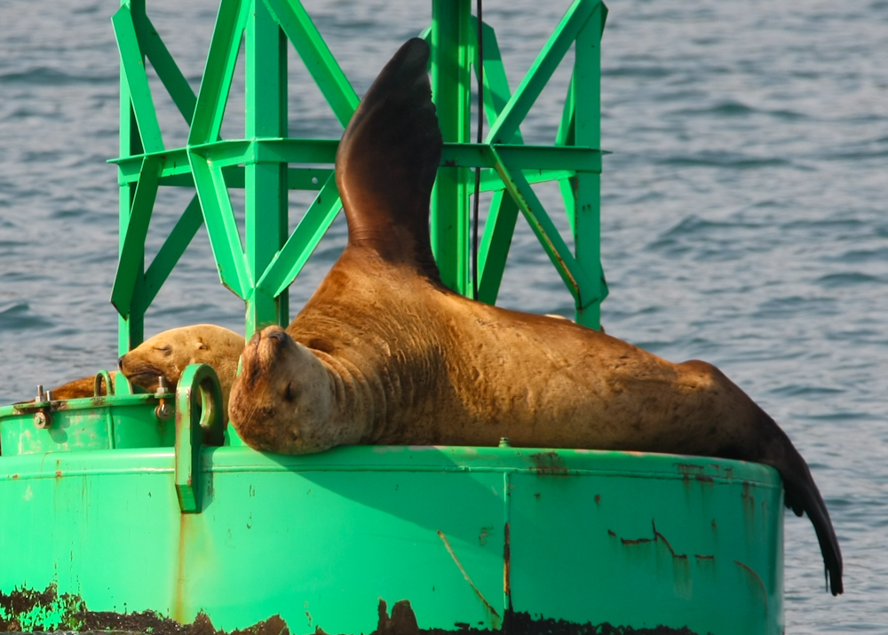 For sea lions, dry space is limited, so 3 were crowded on this buoy.