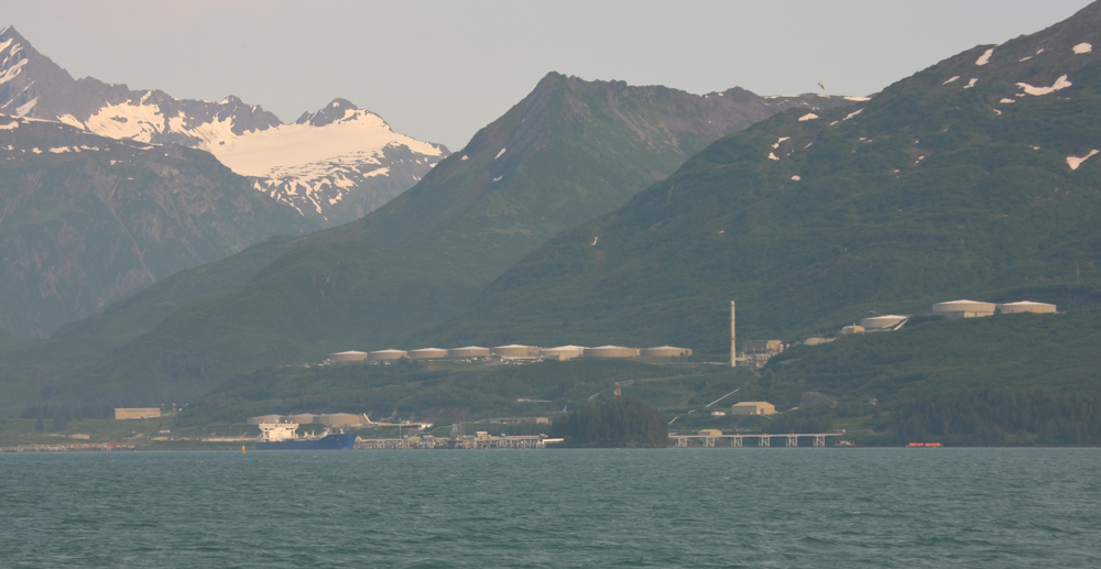 The Alyeska facility where the oil tankers are loaded. The holding tanks for the oil are visible on the hill side.