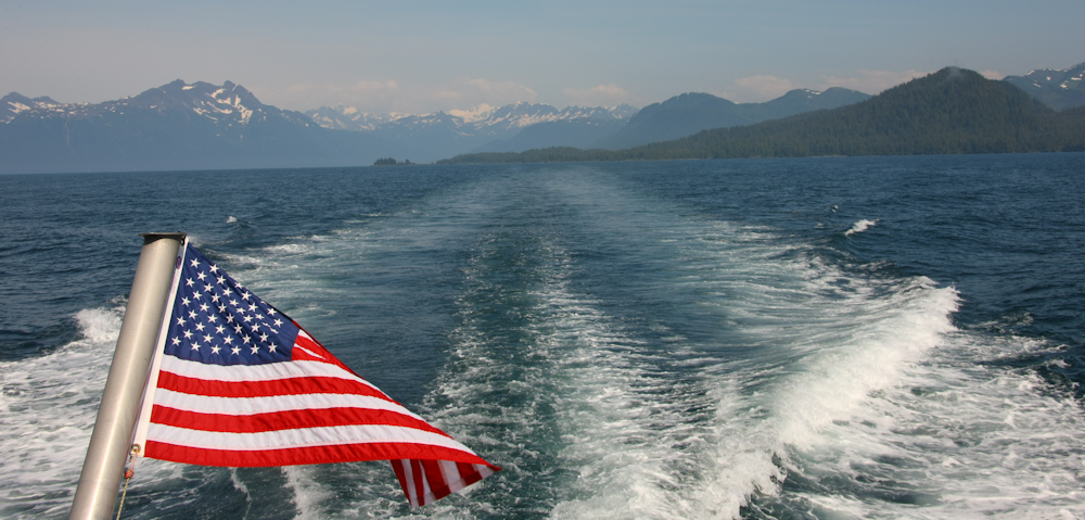 A view over the fan tail as we get into the open waters of Prince William Sound. We did this trip on the 4th of July, so the flag photo was fitting.