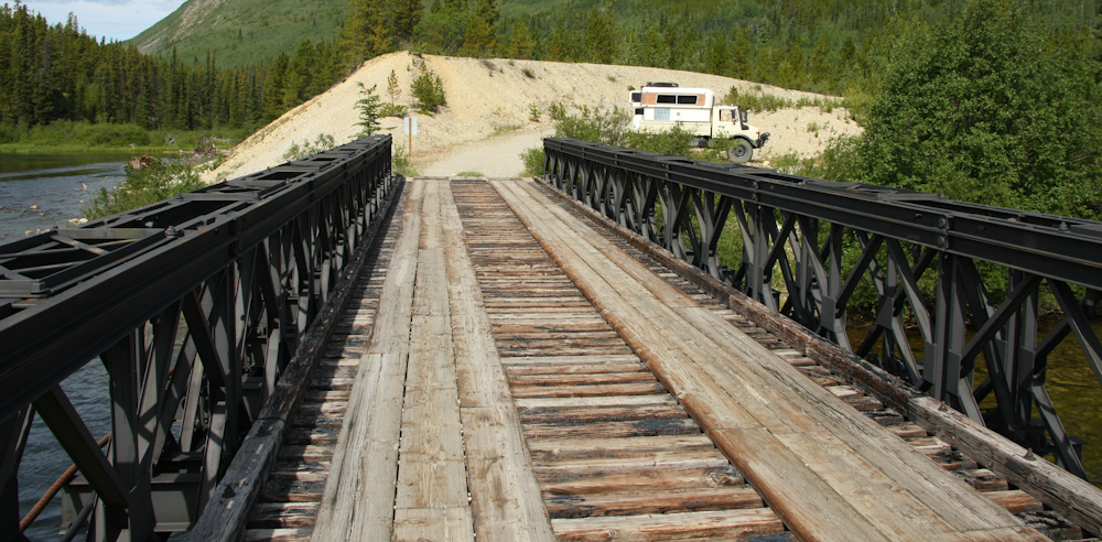 Next day, we left Teslin and continued south. During the middle of the day, we stopped for lunch on a side road that was unmarked. I followed the path for awhile and came upon this bridge. The bridge is made of pre-fab components, very much like the old Bailey bridges we used to assembly when I was in ROTC for the Army Engineers. This is a double-single configuration, as they can be stacked width-wise or height-wise or both. You can even build railroad bridges with these components.