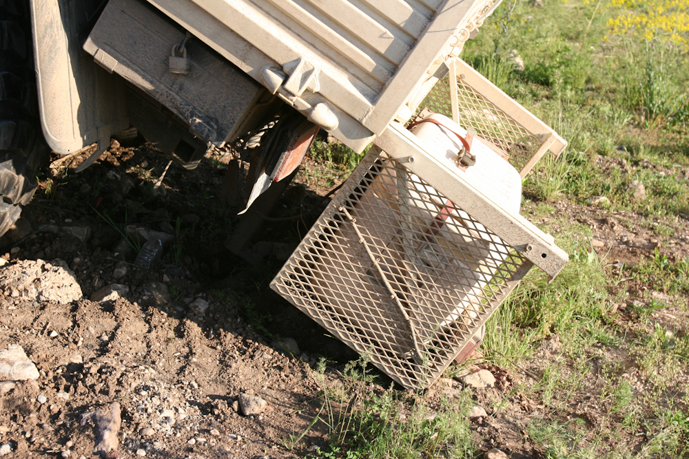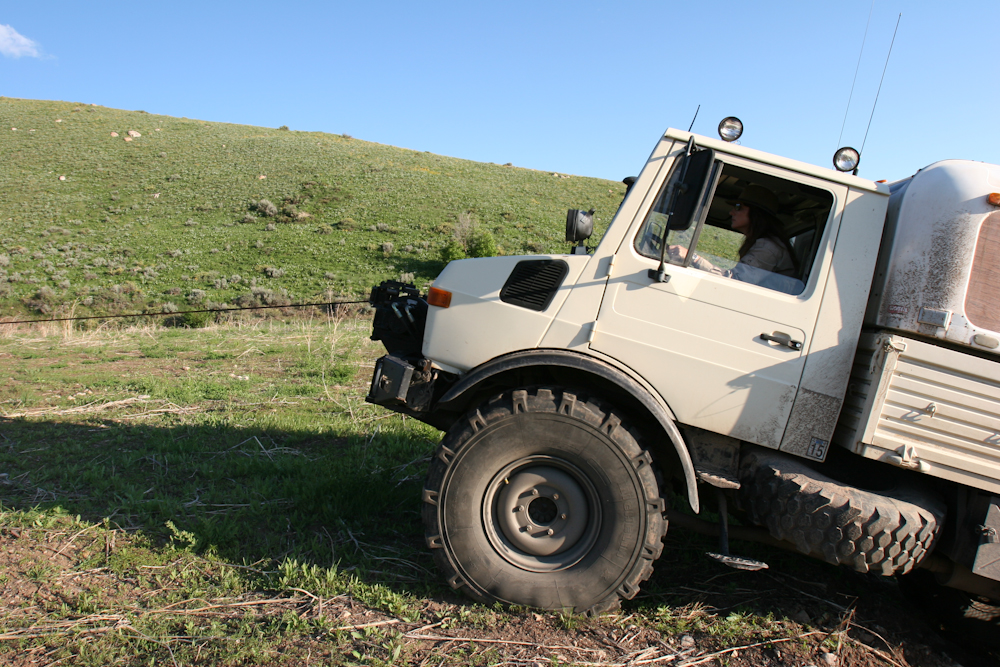 While they were shooting, with a little encouragement from Jud, Kathleen attempts to drive up a berm at the shooting site. She failed to make it up and during her retreat, the cargo basket became a plow. The only easy out was to be winched from the upper terrace.