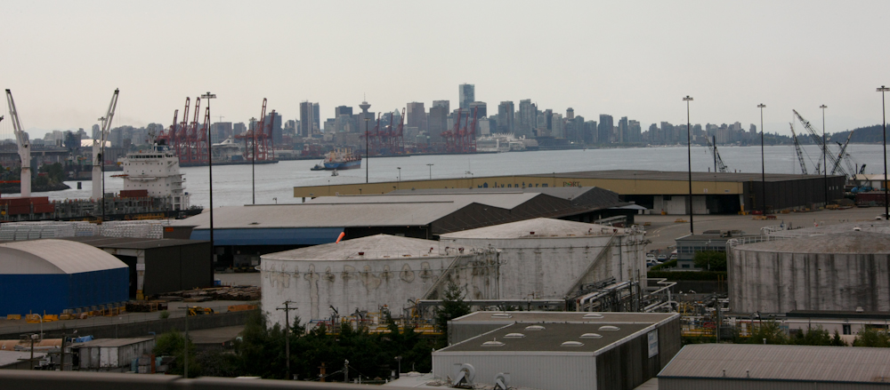 We crossed several major bridges on our way to Langley, BC. From the first bridge, we got a good view of downtown Vancouver and its industrial waterfront.
