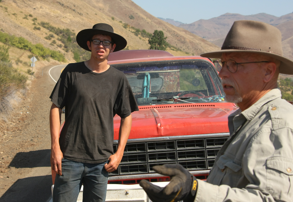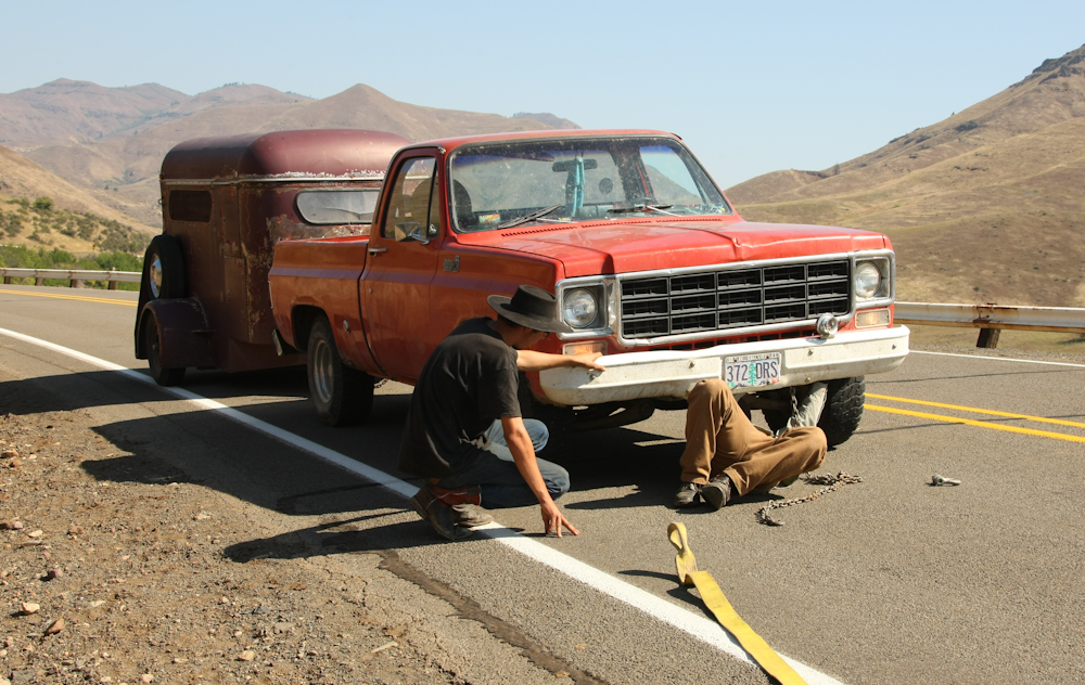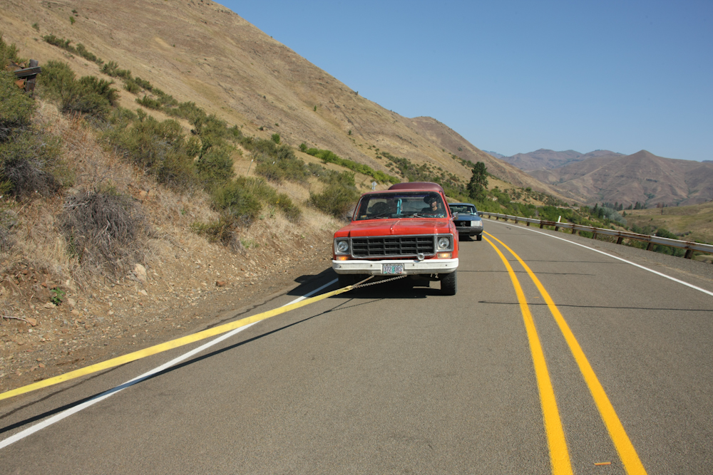 On the steep, narrow upgrade from Hell's Canyon to Halfway, OR we came upon this fellow that had broken down in traffic with a loaded horse trailer. We stopped to render assistance which, in this case, consisted towing him back home. We towed him over several 3500 foot passes with 7% grades.