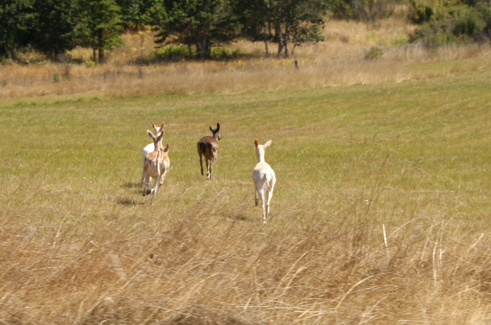 In the hills out of Myrtle Point south of Coos Bay, we passed this herd of deer with two albino does. I had never seen albino deer before and to see several at once was rather remarkable.