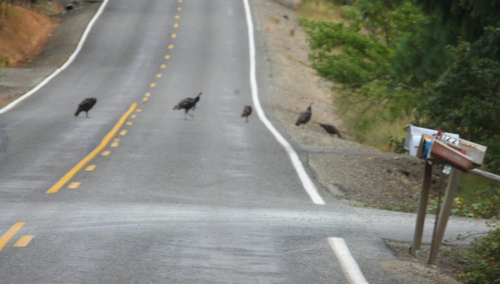 We spent the night near the Oregon Caves park near the creek. It was a nice spot and not crowded. Next morning we went into Cave Junction for supplies and then again headed back into the Siskiyou mountains and over the pass to Happy Camp. Along the way, we spotted this flock of wild turkeys crossing the road.