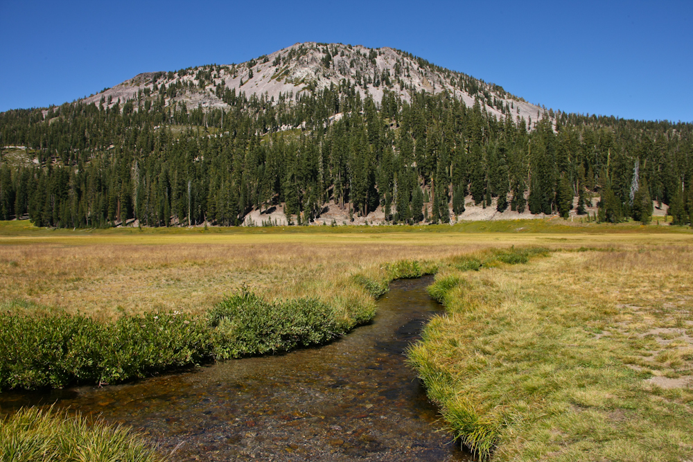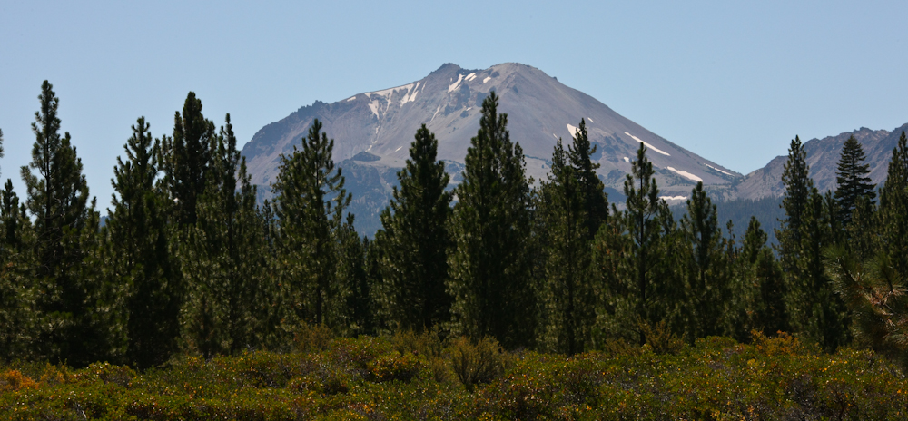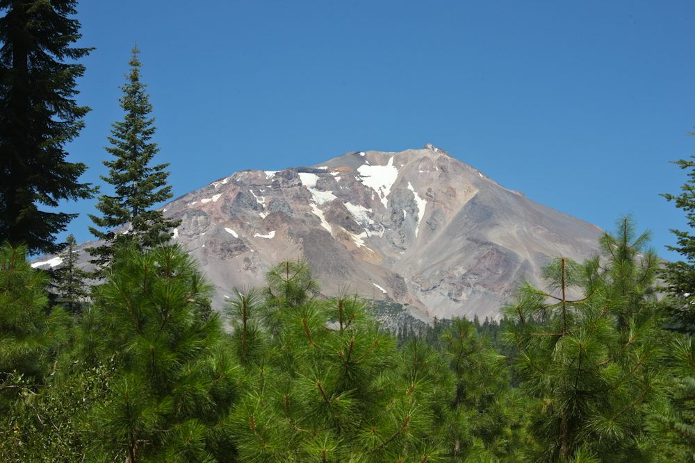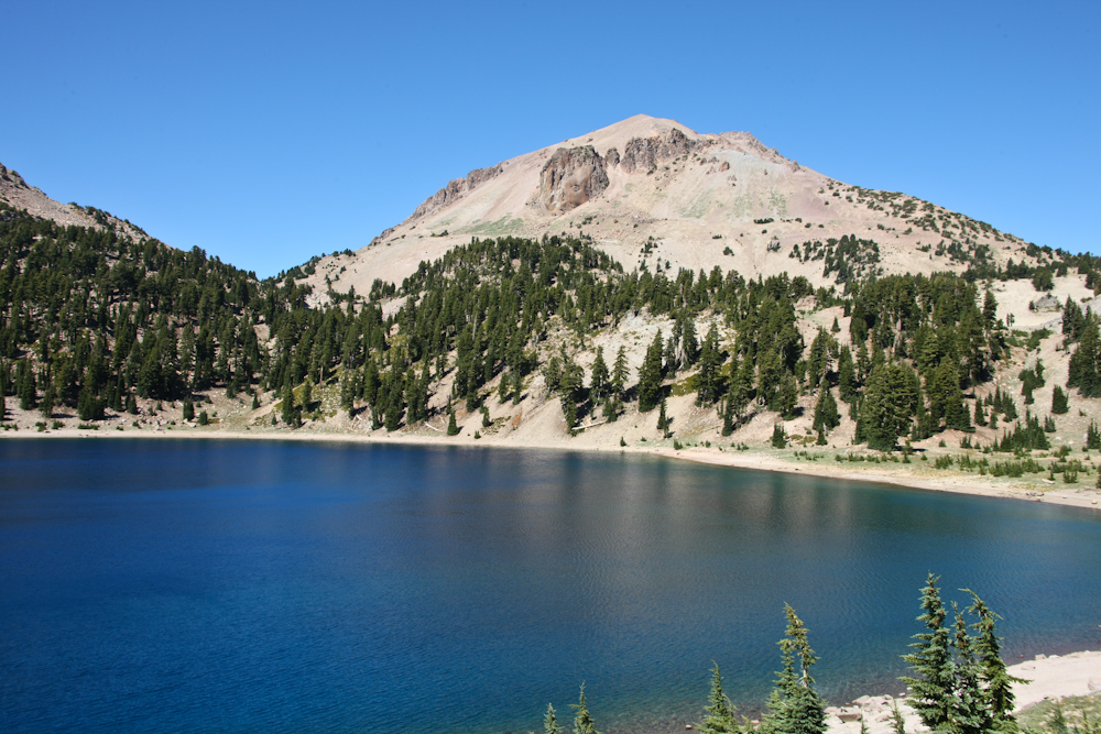 Just past the summit at Lassen was a nice lake. Lassen peak is the dominant structure on the skyline.