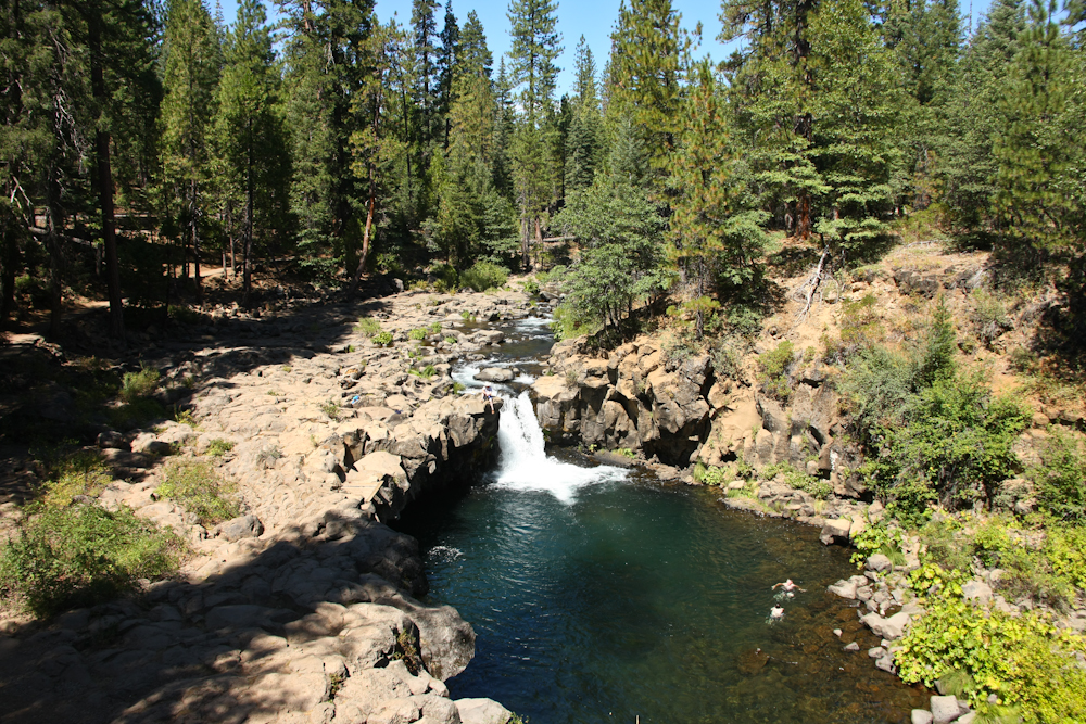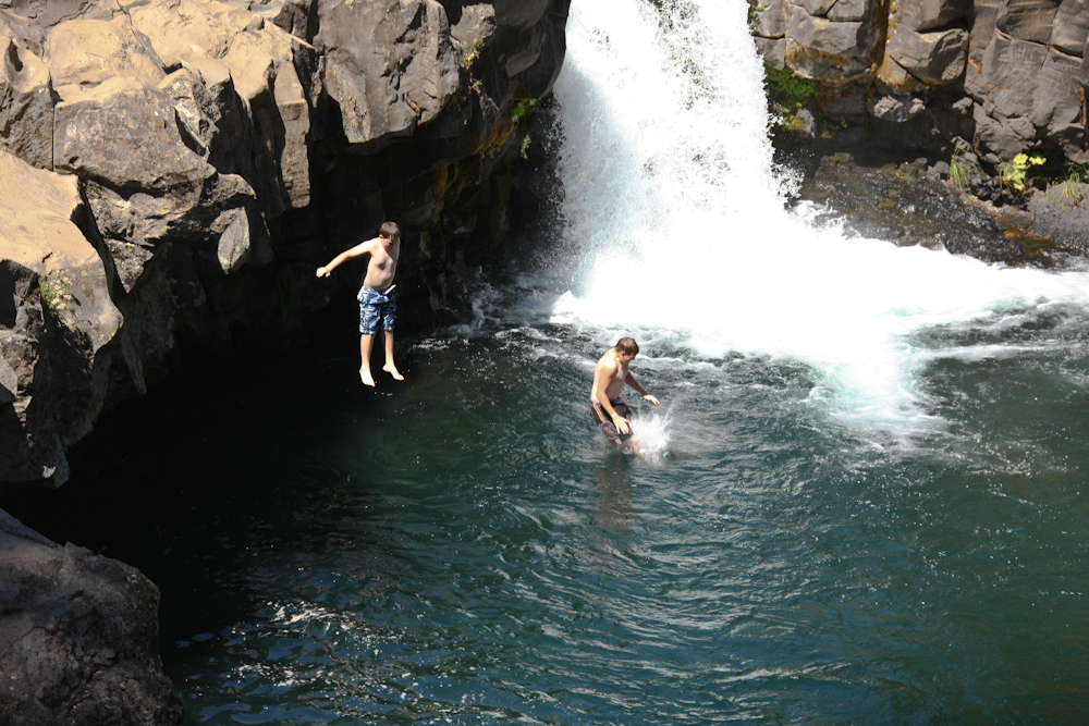 The falls are cut into one of the many basalt flows that cover the area south of Mt. Shasta. The jumpers from the previous photo are visible at the right side of the pool.