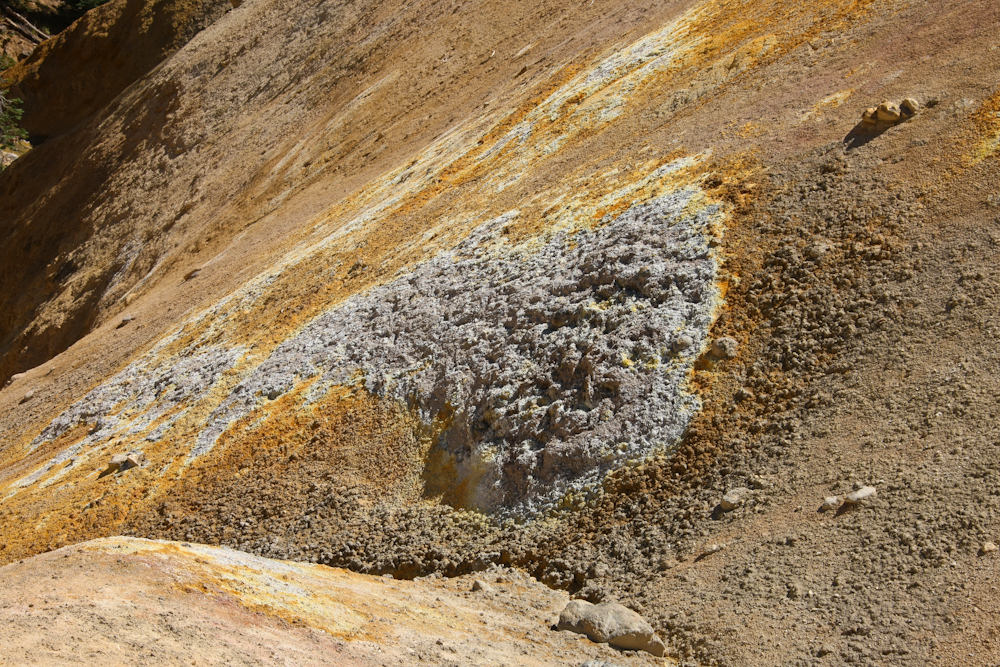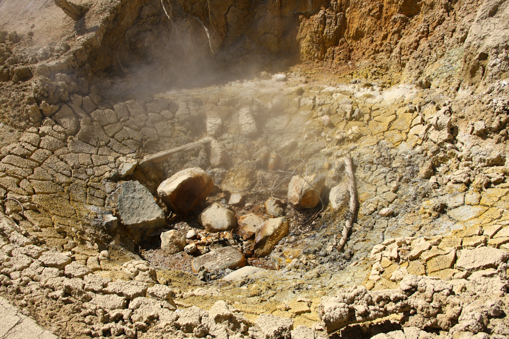 The fumeroles have deposited substantial amounts of sulfur on the ground near their exit ports.