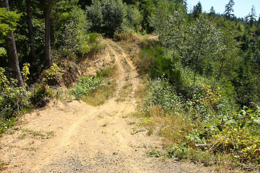 There I was, traveling along and minding my own business and the road had the nerve to be washed out. The road was single lane pavement right up until it was not there. We had traveled many miles south from Alsea on a one lane, twisty-turney road so back-tracking was not that appealing. So, I scoped it out to see if we could cross the obstacle. We had not seen a car all day, so caution was the order of the day. Above, I return from inspecting the far face of the wash-out. Note the height of the embankment behind me; and I am not to the bottom of the wash-out yet!