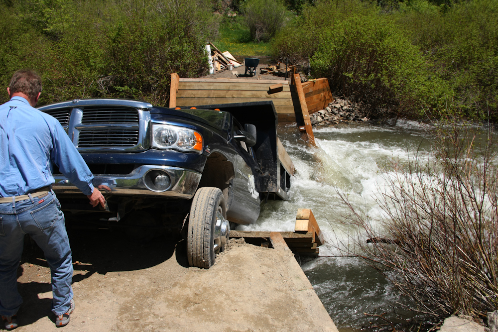 Another view of the bridge. Note that most of the visible wood is new. The operator of the truck is talking to Kathleen.