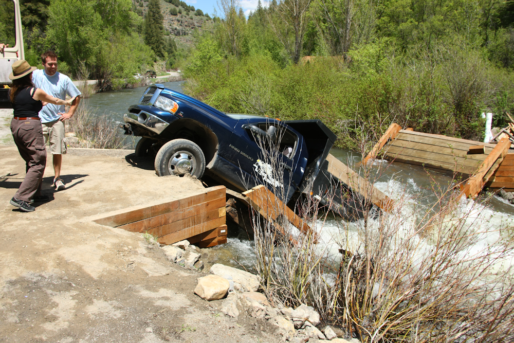 Houston, we have a problem. About mid-way up Logan canyon, we came upon this unlucky fellow, Stevie. It seems that the owner of the bridge was "sure" that the newly refurbished bridge would hold the weight of the truck. Not. The driver was not hurt, but the bridge was totaled. We stopped and I was pretty certain that I could pull him out with my winch. But, we would have had to winch across US 89 (with traffic) and there was a reasonable chance that after I took a strain on the truck, that the river current would pull the truck, and my mog, down river. The fellow with his back to the camera claimed to be an ex-police officer, and he suggested that we NOT winch him out for a variety of reasons, including liability. So, we watched for a bit and then motored on.