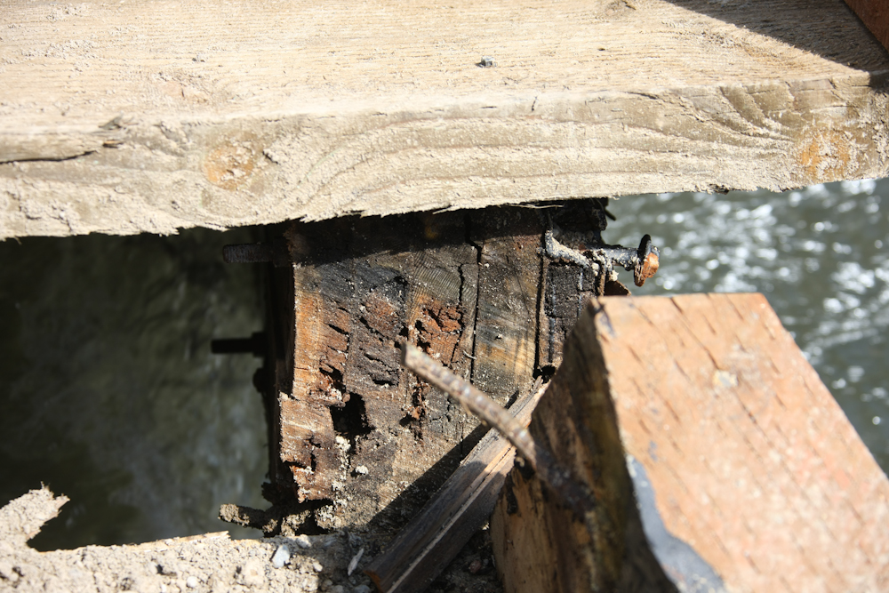 Sadly for both the bridge owner and the truck owner, the main beams of the bridge were not replaced. As can be seen from the photo above, these were "composite" beams formed from a set of 2x12 timbers bolted together. And, it can be seen that they were somewhat rotten, resulting in rotten luck for the trucker.