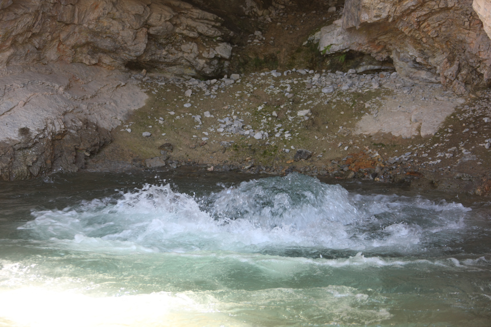 The flow from the spring has eroded a large cavity in the cliff wall. As you can see, the flow is substantial.